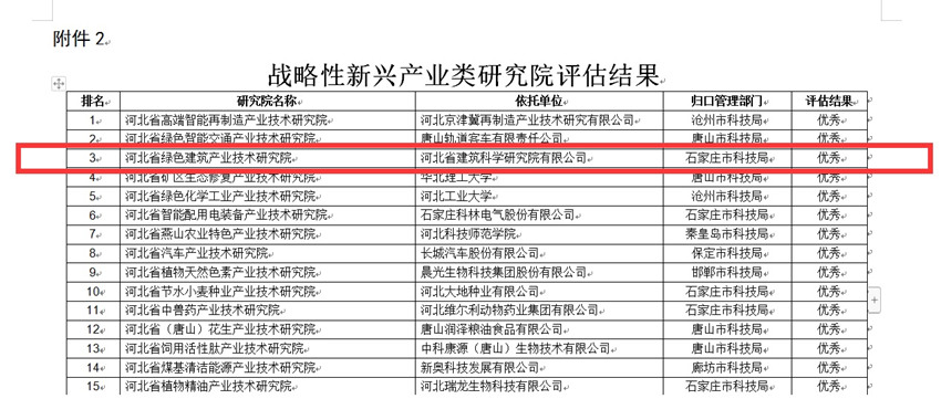 2023年2月9日,河北省科技廳發(fā)布了關(guān)于2022年度省級產(chǎn)業(yè)技術(shù)研究院績效評估結(jié)果的公示。經(jīng)評估,我公司建設(shè)運行的“河北省綠色建筑產(chǎn)業(yè)技術(shù)研究院”榮獲戰(zhàn)略性新興產(chǎn)業(yè)類研究院優(yōu)秀等次。