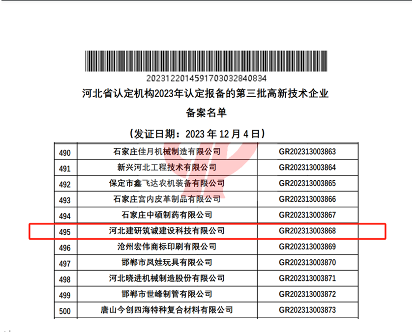 20231220日,全國高新技術企業(yè)認定管理工作領導小組辦公室公示了河北省認定機構2023年認定報備的第三批高新技術企業(yè)備案名單,河北建研筑誠建設科技有限公司順利通過了國家高新技術企業(yè)認定(證書編號GR202313003868),標志著公司在科技創(chuàng)新的道路上又邁出了堅實的一步。