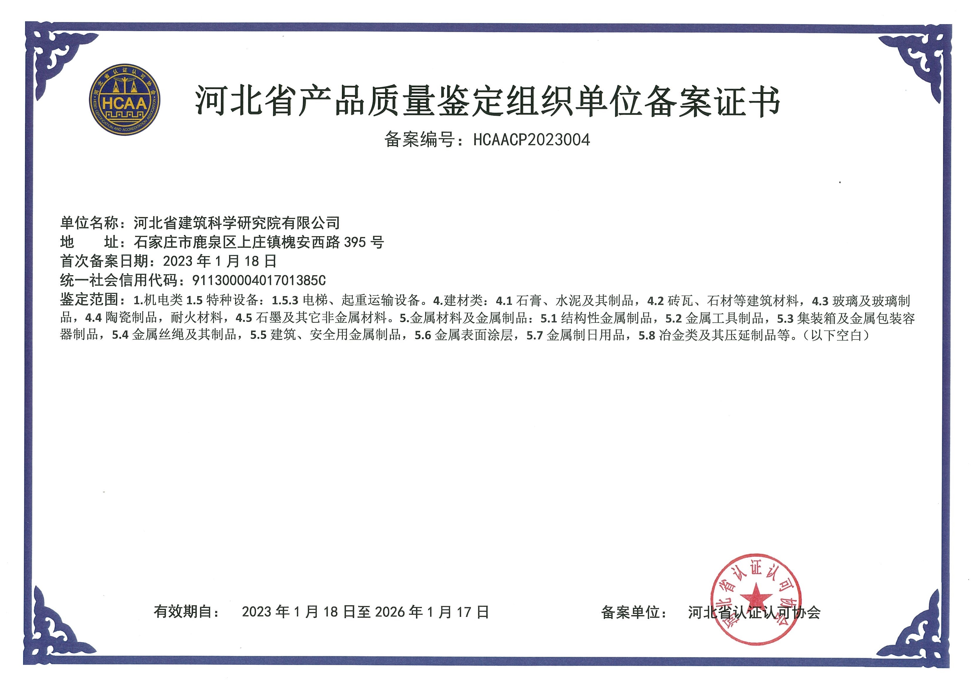 河北省建筑科學研究院有限公司產(chǎn)品質(zhì)量鑒定組織單位備案證書2